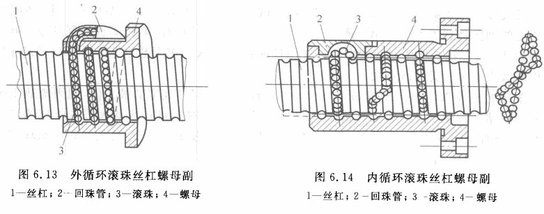 數(shù)控沖床滾珠絲杠副可分為內(nèi)循環(huán)及外循環(huán)兩類。圖6. 13所示為外循環(huán)螺旋槽式滾珠絲杠劇,在螺母的外圓上鏡有螺旋槽,并在螺母內(nèi)部裝上擋珠器,擋珠器的舌部切斷螺紋滾道,迫使?jié)L珠流入通向螺旋槽的孔中而完成循環(huán)。圖6. 14所示為內(nèi)循環(huán)滾珠絲枉副,在螺母外側(cè)孔中裝有接通相鄰滾道的反向器,以迫使?jié)L珠翻越絲杠的齒頂而進(jìn)入相鄰滾道。通常在一個螺母上裝有三個反向器(即采用三列結(jié)構(gòu)),這三個反向器彼此沿螺母圓周相互錯開1200,軸向間隔為4/3-7/3P(P為螺距);有的裝兩個反向器(采用雙列結(jié)構(gòu)),反向器錯開1800,軸向間隔為3/2P。