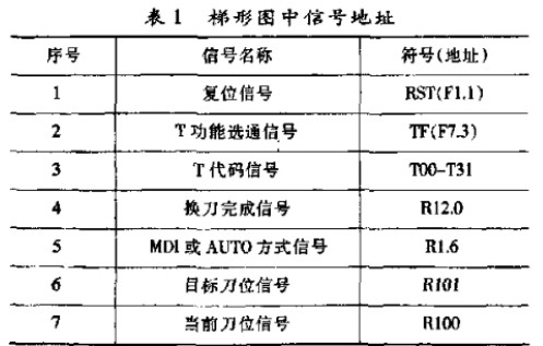 刀塔控制梯形圈如圖4所示。在梯形圖中,系統(tǒng)送出T代碼信號(TOO- T31二進制代碼).經(jīng)TMF時問(參數(shù)設(shè)定).發(fā)出T代碼讀指令信號TF,PLC凌人T代碼,譯碼后,找到T代碼指定的刀號,并與現(xiàn)行刀號進行比較,功能指令COIN(符合檢查)完成目標(biāo)刀位與當(dāng)前刀位的比較,如果不行,刀塔正轉(zhuǎn)換梯形圖中的信號地址如表1所示。內(nèi)部繼電器RII.O—RII.4的作用在梯形圖中已說明,故表1中不再列出。