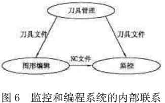 隨著當(dāng)今制造業(yè)靈活快速制造的發(fā)展,數(shù)控沖床也向著具有多種復(fù)合功能、更加穩(wěn)定可靠、更大柔性、適應(yīng)多品種小量的方向發(fā)展,有建立沖壓過程的柔性制造系統(tǒng)的發(fā)展趨勢。本文在進(jìn)行數(shù)控系統(tǒng)監(jiān)控和編程系統(tǒng)的研究和開發(fā)時,力求增強(qiáng)系統(tǒng)柔性,將監(jiān)控和編程系統(tǒng)作為一個內(nèi)部彼此聯(lián)系、相互作用、相互制約的集成性整體。本系統(tǒng)各部分的功能相對獨立,刀具管理系統(tǒng)進(jìn)行刀具庫和刀塔的管理和控制,根據(jù)刀具和刀塔參數(shù)生成刀具文件;圖形編程系統(tǒng)根據(jù)輸入的圖形和加工信息生成NC程序文件;監(jiān)控系統(tǒng)則對沖床加工進(jìn)行監(jiān)控和控制。另一方面,整個系統(tǒng)又是一個相互聯(lián)系、相互制約的集成性整體,圖形編程時,要以刀具管理系統(tǒng)所生成的刀具文件為依據(jù)進(jìn)行人機(jī)交互刀具選擇;而在對沖床進(jìn)行自動加工控制時,需要輸入相應(yīng)的NC程序,而且在加工前要進(jìn)行刀具檢查,檢查該NC程序所需刀具和刀塔上安裝的刀具是否一致。圖6所示為本系統(tǒng)各部分之間的聯(lián)系。