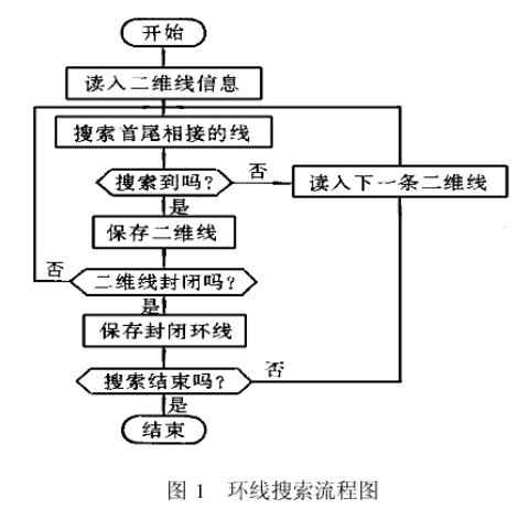 二維CAD圖形中的圖形繪制方法不一定能保證各圖索按次序首尾相接形成封閉的環(huán)線,因而在數(shù)控加工代碼生成時(shí)需要將圖形中的環(huán)線分離出來(lái),作為加工對(duì)象的邊界因此CAD圖形處理的第一步要將離散的二維線整理成按先后次序首尾相接的環(huán)線,其搜索流程如圖1所示