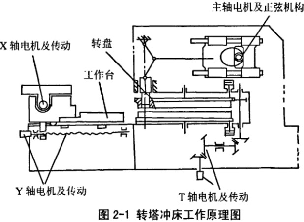 數控轉塔沖床是高速沖床的一種,其擁有多個模位,換模方便快速,可實現敏捷制造,本文講述的數控轉塔沖床為伺服電機驅動式數控沖床,它的工作原理圖如圖2-1所示,主軸采用伺服電機帶動正弦機構,使滑塊上、下往復運動,沖擊上轉盤上所選定的上模而對板材進行沖裁加工,正弦機構可以有效地擴大伺服電機帶動沖頭的沖擊力。上、下轉盤由伺服電機經皮帶輪同步帶動,板料的移動可由滑動夾鉗來完成,X、Y軸方向的運動是由伺服電機、滾珠絲杠副等驅動而實現。數控轉塔沖床的組成主要有以下部件構成: