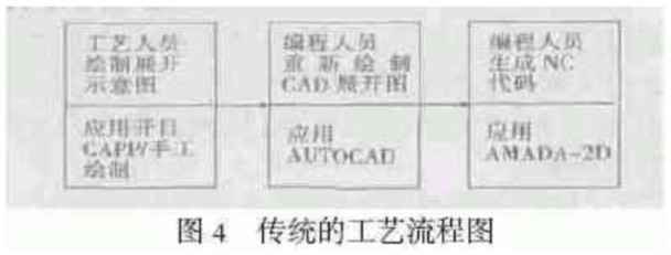 - 2.2.3充分利用設(shè)計(jì)的CAD圖形文件以我所某產(chǎn)品的導(dǎo)熱板為例:用以前的手工編程的模式,編寫一個加工程序的時問約為一天,而且容易出錯,如采用AMADA - 2D編程系統(tǒng),由編程人員按加工定位圖,重新生成CAD圖形,繪制圖形的時問約為l1h~2 h,而生成程序的時間約為30min,效率不高,且很難保證加工的準(zhǔn)確性。如果能將設(shè)計(jì)的CAD圖形與AMADA - 2D編程系統(tǒng)充分地結(jié)合,借助設(shè)計(jì)的CAD圖形,只需1h,就可以完成程序的編制,達(dá)到事半功倍的效果。2.2.4 利用AUTOCAD繪制盒體類零件的展開圖盒體類零件的數(shù)控轉(zhuǎn)塔沖床編程,最重要的工作是如何快速、準(zhǔn)確地生成二維的平面展開圖。傳統(tǒng)的工藝流程如圖4所示。