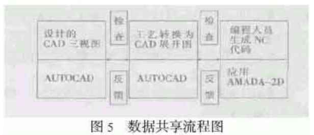 在上述的環(huán)節(jié)中,一方面,由于在開目CAPP中很難嚴(yán)格地按比例繪制零件圖形及展開圖,工藝人員一般所提供的僅僅是零件的展開示意圖,而用于數(shù)控編程的CAD展開圖則必須是嚴(yán)格的、按比例繪制的CAD圖形。另一方面,由于開目CAPP與AUTOCAD不能實(shí)現(xiàn)真正意義上的數(shù)據(jù)共享及圖形交換,不僅存在著工藝人員及數(shù)控編程人員的大量的、不必要的重復(fù)勞動,而且各環(huán)節(jié)并沒有很好的相互檢查的過程,使得出錯的兒率也成倍地增加。充分地利用我所現(xiàn)有的辦公自動化,使設(shè)計(jì)、工藝以及數(shù)控編程人員能夠真正地實(shí)現(xiàn)數(shù)據(jù)共享。不但對編程效率會有一個很大的提高,而且各個環(huán)節(jié)的相互檢查,也能夠使設(shè)計(jì)、工藝以及編程人員的錯誤能夠及時地發(fā)現(xiàn)和糾正,如圖5所示。
