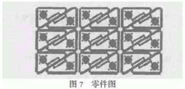 首先利用AUTOCAD的一系列剪切、復(fù)制、對稱、旋轉(zhuǎn)等命令的操作,將兩個零件合理套裁。再利用AMADA - 2D編程系統(tǒng)生成加T程序,進(jìn)行排樣,在(500 mm×240 mm)板料上就能加工 18件零件,如圖7所示。