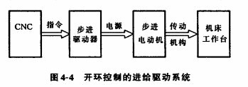 開環(huán)控制一般采用步進電動機作為驅(qū)動元件,如圖4-4所示。由于它沒有位置和速度反饋控制回蹄,從而簡化了線路,設(shè)備投資低,調(diào)試維修都很方便。但它的遞給速度和精度都較低,一般應(yīng)用于經(jīng)濟型數(shù)控沖床及普通的機床改造。