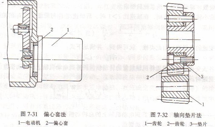 1)偏心套調(diào)整法如圖7-31所示,將相互嚙合的一對齒輪中的一個齒輪裝在電動機輸出軸上,并將電動機1安裝在偏心套2(或偏心軸)上,通過轉(zhuǎn)動偏心套的轉(zhuǎn)角,就可調(diào)節(jié)兩嚙合齒輪的中心距,從而消除圓柱齒輪正、反轉(zhuǎn)時的齒側(cè)間隙。特點是結(jié)構(gòu)簡單,但其側(cè)隙不能自動補償。