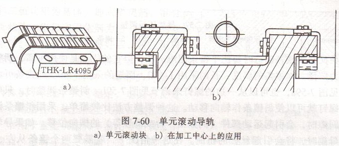 (1)滾動導(dǎo)軌塊這是一種滾動體作循環(huán)運動的滾動導(dǎo)軌。移動部件運動時,滾動體措封閉軌道作循環(huán)運動。滾動體為滾珠或滾柱。數(shù)控沖床上采用的滾柱式滾動導(dǎo)軌塊如圖7.60所示,它多用于中等負(fù)荷導(dǎo)軌。滾動導(dǎo)軌塊由專業(yè)廠家生產(chǎn),有各種規(guī)格、形式供用戶選用。使用時,導(dǎo)軌塊裝在運動部件上,每一導(dǎo)軌應(yīng)至少用兩塊或更多塊,導(dǎo)軌塊的數(shù)目取決于導(dǎo)軌的長度和負(fù)載的大小。與之相對的導(dǎo)軌多用鑲鋼淬火導(dǎo)軌。滾動導(dǎo)軌塊的調(diào)整可參見加工中心SOLON3-1導(dǎo)軌部分。