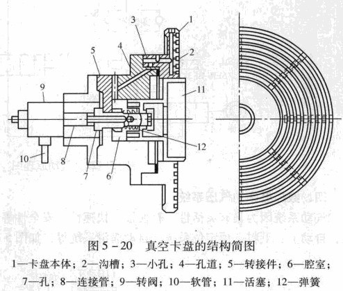 在卡盤的前面裝有吸盤,盤內(nèi)形成真空,而薄的被加工件就都大氣壓力被壓在吸盤上以達到夾緊的目的。一般在卡盤本體1上開有數(shù)條圓形的溝糟2,這些溝槽就是前面提到的吸盤,這些吸盤是通過轉(zhuǎn)接件5的孔道4與小孔3相通,然后與卡盤體內(nèi)氣缸腔室6相連接。另外腔室6通過氣缸活塞桿后部的孔7通向連接管8,然后與裝在主軸后面的轉(zhuǎn)閥9相通。通過軟管10同真空泵系統(tǒng)相連接,按上述的氣路造成卡盤本體溝槽內(nèi)的真空,以吸著工件。反之,要取下被加工的工件時,向溝槽內(nèi)通以空氣。氣缸腔室6內(nèi)有時真空有時充氣,所以活塞11有時縮進有時伸出。此活塞前端的凹窩在卡緊時起到吸著的作用。即工件被安裝之前缸內(nèi)腔室與大氣相通,所以在彈簧12的作用下活塞伸出卡盤的外面。當工件被卡緊時缸內(nèi)造成真空則活塞頭縮進,一般真空卡盤的服引力與吸盤的有效面積和吸盤內(nèi)的真空度成正比。在自動控制中,有時要求卡緊速度要快,而卡緊速度則由真空卡盤的排氣量來決定。
