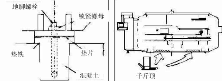 在上轉(zhuǎn)塔盤(pán)的X軸、Y軸力向放兩個(gè)水平塊。存數(shù)控轉(zhuǎn)塔沖床的地腳部分和摯鐵部分插入墊片,以調(diào)數(shù)控轉(zhuǎn)塔沖床床的水平。用液壓千斤頂抬起機(jī)床(見(jiàn)右下角圖)插入墊片。不要抬起電氣控制箱的底部。機(jī)床的x軸、Y軸方向的水平范圍在+0.05mm/m。