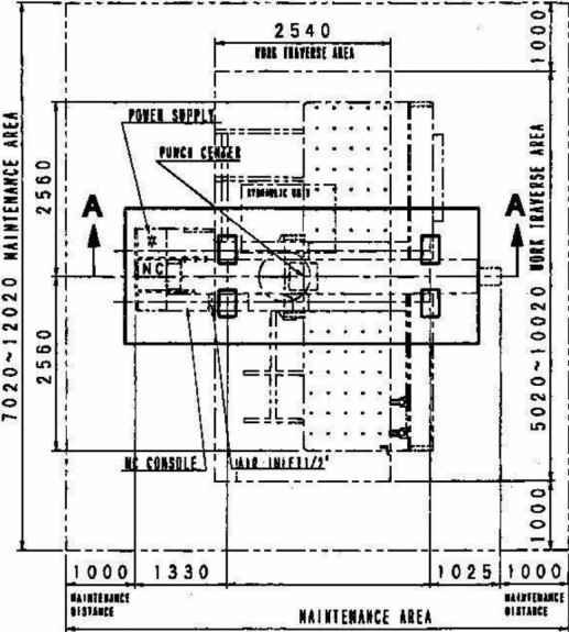 安裝的場(chǎng)所應(yīng)充分考慮到數(shù)控沖床機(jī)器及材料的移動(dòng)、材料的搬進(jìn)及搬出、以及數(shù)控沖床機(jī)器及其它裝置的保養(yǎng)檢查等之作業(yè),同時(shí)在數(shù)控沖床及其它的裝置之周?chē)鷳?yīng)預(yù)留充分的空間。 空氣壓縮裝置應(yīng)放置在離機(jī)床不超過(guò)5米遠(yuǎn)的地方。安裝的場(chǎng)所應(yīng)遠(yuǎn)離易產(chǎn)生灰塵或粉末的機(jī)器。雖然機(jī)床具在防電磁干擾的功能,但足也應(yīng)該離開(kāi)焊接機(jī)、鉆床、噴砂機(jī)、以及研磨機(jī)等易于產(chǎn)生電源噪音的機(jī)器3米以下的距離。需要提供堅(jiān)實(shí)、水平的混凝十地基(600mm厚)安裝數(shù)控沖床。地基圖山AMADA提供。