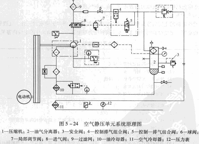 機(jī)床采用空氣靜壓導(dǎo)軌,空氣由空氣靜壓?jiǎn)卧峁?,工作原理如圖5 -24所示。經(jīng)分析研究認(rèn)為可能產(chǎn)生故障的原因是:①進(jìn)口空氣過(guò)濾器阻塞;②出口管路有泄漏;③安全閥失靈;④排氣閥失靈;⑤進(jìn)氣間沒(méi)有打開;⑥壓縮機(jī)失效。