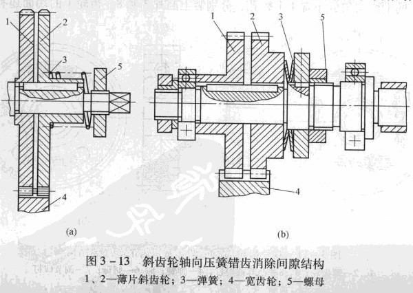 (2)軸向壓簧調(diào)整法。圖3 -13所示為斜窗輪軸向壓簧錯齒消除間隙結(jié)構(gòu)。該結(jié)構(gòu)的消除間隙原理與軸向墊片調(diào)整法相似,所不同的是利用齒輪2右面的彈簧壓力使兩個薄片齒輪的左右齒面分別與寬齒輪的左右齒面貼緊,以消除齒側(cè)間隙。因3 -13 (a)所示結(jié)構(gòu)中采用的是壓簧,圖3-13 (b)所示結(jié)構(gòu)中采用的是碟形彈簧。