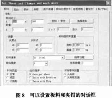 3.4添加沖壓(1)-般零件均可通過(guò)軟件的自動(dòng)沖壓功能添加沖壓。根據(jù)需要我們可以設(shè)置相關(guān)的沖壓參數(shù),便可實(shí)現(xiàn)自動(dòng)沖壓。(2)對(duì)于特殊圖形也可以手動(dòng)添加沖壓??梢愿鶕?jù)需要選取模具,選擇沖壓類(lèi)型以及沖壓時(shí)的模具順序等,設(shè)定后在圖形中直接添加沖壓。例如選擇十字模,進(jìn)行“單沖”加T-1:件的嘲角(圖7)。我們可以利用我們能更清楚的是在一張大板上可以方便的幫助(1)點(diǎn)擊工具欄中的設(shè)置板料和夾鉗圖標(biāo),出現(xiàn)圖8所示對(duì)話(huà)框,在這里我們可以根據(jù)實(shí)際需要,設(shè)定板料的尺寸、材料的厚度、加工工件的數(shù)量等。(2)同時(shí),在這里可以點(diǎn)擊“夾鉗”,出現(xiàn)夾鉗設(shè)定的對(duì)話(huà)框,根據(jù)需要設(shè)定夾鉗的個(gè)數(shù)及位置。
