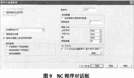 (3)點(diǎn)擊“再定位”,在“避開(kāi)夾鉗,使用夾鉗移動(dòng)”前,加“、/”,則軟件將用移動(dòng)夾鉗實(shí)現(xiàn)夾鉗的避讓功能,而在機(jī)器的行程范圍內(nèi)加工時(shí)無(wú)需再定位。3.6生成NC程序完成上述的各種加工要求的設(shè)定后,便可以生成加工指令了。(1)點(diǎn)擊工具欄中的生成加工指令圖標(biāo),根據(jù)軟件的提示點(diǎn)擊“下一步”,“下一步”,“下一步”,出現(xiàn)圖9所示對(duì)話(huà)框。