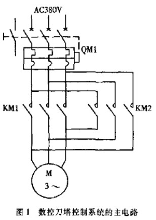 數(shù)控刀塔控箭系統(tǒng)的主電路如圖l所示。其中QMI為刀塔電機M的保護開關(guān),它的作用是接通/斷開電源及短路、過載保護,其輔助觸點輸入列PLC,作為狀態(tài)信號.KMI、KM2為刀塔電動機正反轉(zhuǎn)的交流接觸器。
