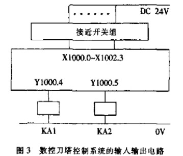 PLC輸入輸出電路如圖3所示。接近開關(guān)檢測刀塔的當(dāng)前刀位,它將當(dāng)前刀位信號(XIOOO.O ~X1002.3)輸入至PLC;CNC送出T代碼信號給PLC,PLC將T代碼指定的目標(biāo)刀位與當(dāng)前刀位進行比較,如果不符,發(fā)出換刀指令.PLC輸出信號Y1000.4至強電柜中的正轉(zhuǎn)繼電器KAI,刀塔正轉(zhuǎn)換刀;到位后,PLC輸出信號Y1000.5至強電柜中的反轉(zhuǎn)繼電器KA2,刀塔反轉(zhuǎn)鎖緊,CNC發(fā)出完成信號。