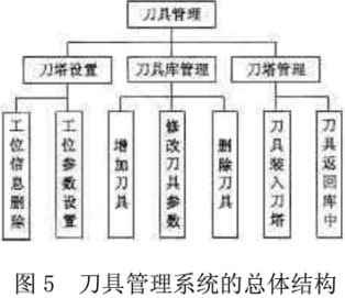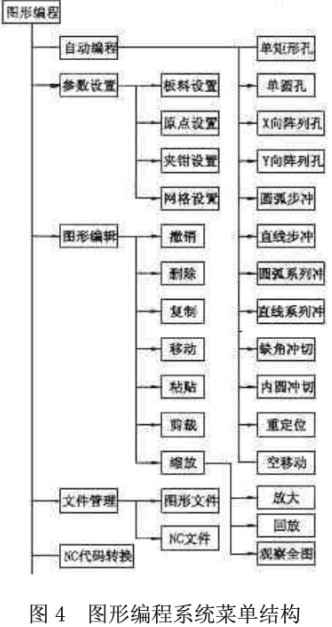 數(shù)控沖床監(jiān)控和編程系統(tǒng)的總體結(jié)構(gòu)分為三部分:監(jiān)控子系統(tǒng)、編程子系統(tǒng)和刀具管理子系統(tǒng),其中編程子系統(tǒng)包括圖形編程和手工編程兩部分。手工編程只需調(diào)用Windows中已有的編輯器如Notepad即可實現(xiàn)。監(jiān)控和編程系統(tǒng)的結(jié)構(gòu)如圖3所示。監(jiān)控、編程和刀具管理三個子系統(tǒng)分別完成系統(tǒng)的一部分功能,相對獨立,不同子系統(tǒng)在數(shù)據(jù)結(jié)構(gòu)、控制算法和控制模式等方面具有不同的性質(zhì)和特點,同時,整個系統(tǒng)又是各子系統(tǒng)的有機(jī)組合,有著密切的聯(lián)系,因而各子系統(tǒng)之間必須存在著信息交換和協(xié)調(diào)問題。在進(jìn)行系統(tǒng)的研究和設(shè)計時,應(yīng)盡量減少各部分之間的耦合,以利于各子系統(tǒng)功能的實現(xiàn):同時應(yīng)保持各系統(tǒng)之間清晰的信息接口,以增強(qiáng)系統(tǒng)的重構(gòu)和擴(kuò)展能力。圖形編程系統(tǒng)菜單結(jié)構(gòu)見圖4,刀具管理系統(tǒng)的總體結(jié)構(gòu)見圖5。