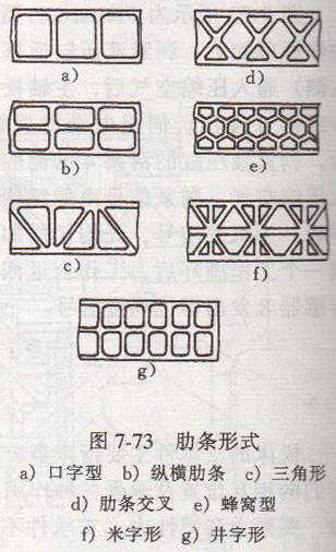 采用合理的結(jié)構(gòu)加大接觸剛度,提高支承件的剛度。整體結(jié)構(gòu)的剛度大于分體的剛度。在支承件分體時(shí),提高表面接觸面積,加大預(yù)緊力,可較好的提高接觸剛度。在支承件自身結(jié)構(gòu)中,在材料截面面積相同的條件下,空心結(jié)構(gòu)的剛度比實(shí)心結(jié)構(gòu)好;封閉式結(jié)構(gòu)的剛度大于開(kāi)式結(jié)構(gòu)的剛度;方形截面的抗彎剛度大于圓形截面的抗彎剛度,而圓形截面的抗扭剛度高于方形截面的抗扭剮度。根據(jù)受力情況,選擇好截面形狀,能提高支承件的剛度。配置好加強(qiáng)肋板和加強(qiáng)肋,能顯著地提高支承件的剛度。肋板連接了支承件的兩壁,縱向肋板主要提高抗彎剛度,橫向肋板主要提高抗扭剮度,斜向肋板兼有提高抗彎和抗扭剛度。肋條被制在支承件的內(nèi)壁上,主要是為了提高局部剛度,減少局部變形和薄壁振動(dòng)。肋條也有縱向、橫向和斜向的。如圖7-73所示,圖中口字型肋條最簡(jiǎn)單;縱橫肋條,直角相交也容易制造,但容易產(chǎn)生內(nèi)應(yīng)力;三角形分布肋條能夠保證足夠的剛度,多用于矩形截面床身的寬壁處;肋條交叉布置,能提高剛度,常用于重要床身的寬壁上;蜂窩型肋條,用于平板上,由于各方面能均勻收縮,所以內(nèi)應(yīng)力?。痪掷邨l其單元壁板的抗彎剛度接近米字形,但剛度是米字形的二分之一。米字形鑄造困難,所以一般鑄鐵床身采用井字形,焊接床身米字型。肋條的高度一般不得大于支承件壁厚的5倍,肋條的厚度一般是床身壁厚的00.8倍。
