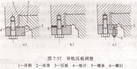在垂直方向調(diào)整間隙時(shí),一般都是采用下壓板來調(diào)整它的底面間隙。常用方法見圖7-57所示。圖中a是修刮壓板與下導(dǎo)軌面的接觸面,這種調(diào)整辦法比較麻煩費(fèi)時(shí),必須多次拆裝。圖中b是在壓板與接臺面之間采用墊片,修磨墊片厚度,以調(diào)整間隙;采用鑲條,改變鑲條位置來控制底面間隙。這種結(jié)構(gòu)調(diào)整方便,但剛度稍差。