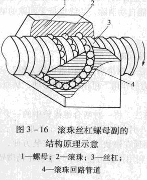 滾珠絲杠螺母副的結(jié)構(gòu)原理示意如圖3 -16所示。在絲杠3和螺母1上都有半圓弧形的螺旋槽,當它們套裝在一起時便形成了滾珠的螺旋滾道。螺母上有滾珠回路管道4,將幾圈螺旋滾道的兩端連接起來,構(gòu)成封閉的循環(huán)滾道,并在滾道4內(nèi)裝滿滾珠2。當絲杠旋轉(zhuǎn)時,滾珠在滾道內(nèi)既自轉(zhuǎn)叉沿滾道循環(huán)轉(zhuǎn)動,迫使螺母(或絲杠)軸向移動。