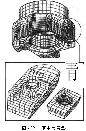 對于數(shù)控沖床機夾可轉(zhuǎn)位刀片鏡刀的安全性,除了刀體的強度外,還有零件、刀片夾緊的可靠性。為了能在設(shè)計階段對刀具的結(jié)構(gòu)強度在離心力作用下受力和變形情況進(jìn)行定性和定量的分析,可通過有限元方法計算不同轉(zhuǎn)速下應(yīng)力大小,模擬失效過程和改進(jìn)設(shè)計方案。有限元模型包括如圖8-13所示的刀體與刀片座、刀片、夾緊螺釘三部分。首先計算刀體(包括螺釘、刀片等零件的質(zhì))的純彈性變形,接著對分離出來的刀座做詳細(xì)的分析,把前面獲得的刀體彈性變形作為邊界條件加到刀座分離體上。然后由切出的刀座、刀片、螺釘及無質(zhì)量的摩擦劇組成了刀片夾緊系統(tǒng)的模型,進(jìn)行夾緊的可靠性分析。有限元模型能模擬刀片在刀座里的傾斜、滑動、轉(zhuǎn)動,以及螺釘在夾緊時的變形,可計算在不同轉(zhuǎn)速下的刀片位移和螺釘受力大才根據(jù)計算和試驗,機夾可轉(zhuǎn)位恍刀在高速下的失效。
