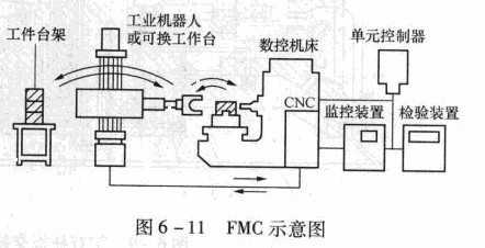 作為柔性制造系統(tǒng)的基本單位是各種制造單元中,它的基本單位就是數(shù)控沖床和工業(yè)機器人等組成的“加工單元”。圖6 -11所示為柔性制造單元示意圖,它由數(shù)控沖床、工件臺架、工業(yè)機器人或可換工作臺、監(jiān)控裝置、檢驗裝置及加工單元的控制器等6部分組成。