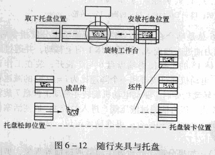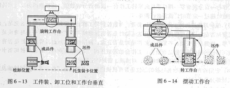 圖6 -13所示為工件裝、卸工位和工作臺垂直排列,此時旋轉(zhuǎn)工作臺必須先移到卸荷工位,將隨行夾具連同成品卸下,然后移到安裝工位,接受裝有坯件的隨行夾具。