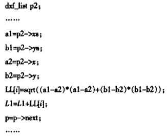 放的H.而繪圖的順序是不固定的,因此必須對實(shí)體圖形各個元素進(jìn)行排序,將直線元素保存在雙向鏈表中,讓各個元素的首節(jié)點(diǎn)和尾節(jié)點(diǎn)首尾相連組成封閉環(huán).可以得到一個新的鏈表pl。這個鏈表中保存的信息就是零件圖主視圖的外輪廓線。然后找出該鏈表中直線長度等于板料厚度的元素,即主視圖中兩側(cè)短豎線,并以此為分界點(diǎn),提取出一個新鏈表p2。p2中所包含的元素為主視圖中的5段直線,最后將p2中每條直線的長度相加即可得尺寸Ll。部分程序如下: