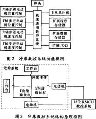 沖床作業(yè)件是沖頭.x、Y向送料機(jī)構(gòu)驅(qū)動(dòng)電動(dòng)機(jī)選用2臺(tái)步進(jìn)電動(dòng)機(jī),控制器是單片機(jī)。由高性能的單片機(jī)對(duì)步進(jìn)電動(dòng)機(jī)的位置和速度進(jìn)行控制,以滿足加工精度要求?刂圃砣缦拢簭膯纹瑱C(jī)發(fā)出的高低電平通過(guò)光電隔離裝置控制步進(jìn)電動(dòng)機(jī)正反轉(zhuǎn),輸出的控制脈沖個(gè)數(shù)控制電動(dòng)機(jī)的轉(zhuǎn)角,輸出脈沖頻率控制電動(dòng)機(jī)的轉(zhuǎn)速。系統(tǒng)功能框圖如圖2所示,結(jié)構(gòu)原理框圖如圖3所示。