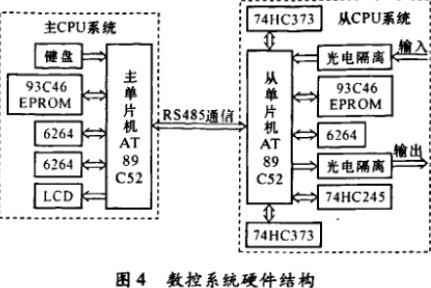 根據(jù)沖床數(shù)控系統(tǒng)實(shí)現(xiàn)的功能,完成數(shù)控系統(tǒng)的硬件設(shè)計(jì)。硬件設(shè)計(jì)主要包括微處理器( CPU)以及外圍擴(kuò)展接口的設(shè)計(jì)。系統(tǒng)CPU采用雙MCU結(jié)構(gòu),設(shè)計(jì)成主從式分布結(jié)構(gòu),即分為主CPU和從CPUtI,二者之間通過(guò)RS485串口通訊。主CPU系統(tǒng)主要負(fù)責(zé)完成用戶加工程序的輸入處理、文字圖形顯示、自診斷、系統(tǒng)監(jiān)控等管理工作。從CPU系統(tǒng)負(fù)責(zé)完成數(shù)據(jù)運(yùn)算、插補(bǔ)計(jì)算以及位置控制、速度控制等實(shí)時(shí)作業(yè)。