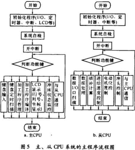 系統(tǒng)的軟件設(shè)計(jì)必須以硬件為載體,根據(jù)硬件電路實(shí)現(xiàn)的功能編寫相應(yīng)的程序集。根據(jù)硬件電路的主從式CPU結(jié)構(gòu),數(shù)控系統(tǒng)的軟件也包括主CPU軟件和從CPU軟件,各包括多個(gè)功能模塊。主從CPU系統(tǒng)的主程序流程網(wǎng)如圖5所示。