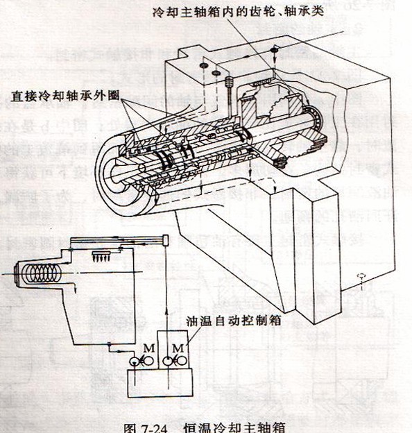 如圖7-24所示,是恒溫油液循環(huán)潤滑冷卻方式。由油溫自動控制箱控制的恒溫油液,經(jīng)油泵打到潤軸箱,一路沿主軸前支承套外暖上的螺旋槽流動,帶走主軸軸承所發(fā)出的熱量。另一路通過主輔精內(nèi)的分油器,把恒溫油噴射到傳兩齒輪和傳動軸支承軸承上,以帶走它們所產(chǎn)生的熱量。這種方式潤滑和降溫效果都很好。